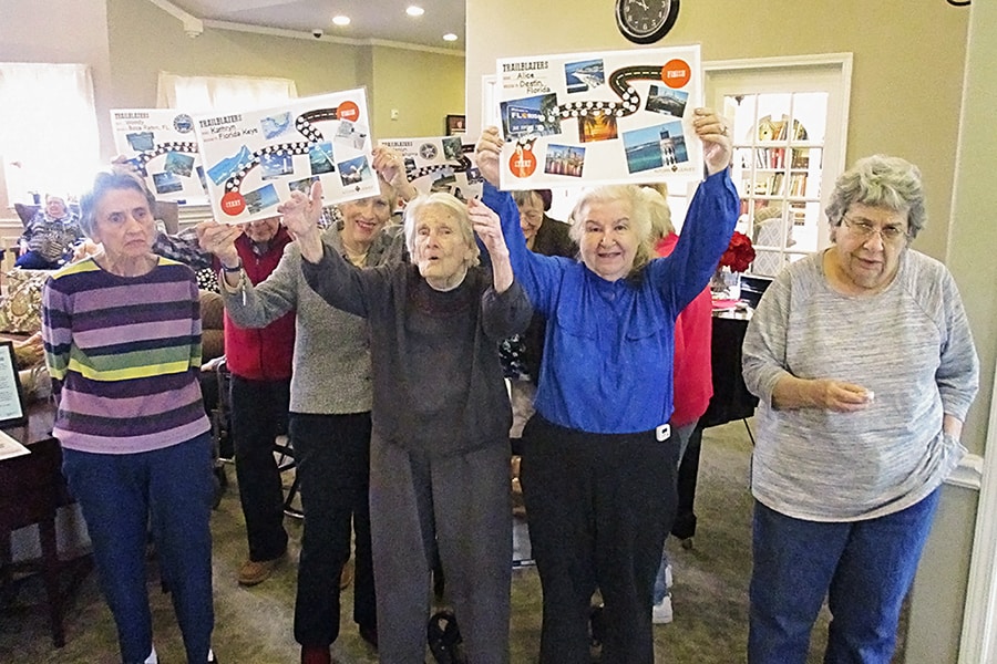 “The Trailblazer program is a way to unlock memories,” says Director of Life Engagement, Clair Jameson. “So I can sit down with a resident and talk about places they’ve loved in their lifetime, where they’d like to go if they could go anywhere they wanted today.” The residents’ destinations are the focus of weekly walks where they look at photos from the location, tell stories about its history, and reminisce on past trips. Once they’ve arrived at their destination at the end of their personalized map, we incorporate these memory points into a celebration. For example, if a resident chooses Key West, they may share a slice of Key Lime pie with fellow Trailblazers or study beautiful sea shells with their hands to evoke those emotions and memories from past beach trips. The Trailblazer activities serve a dual purpose; getting residents moving and setting the stage for moments of joy as past memories are fondly recalled. It should also be noted that anyone can be a Trailblazer, regardless of mobility! Walkers, wheelchairs, and other mobility aids are easily accommodated to the walks.